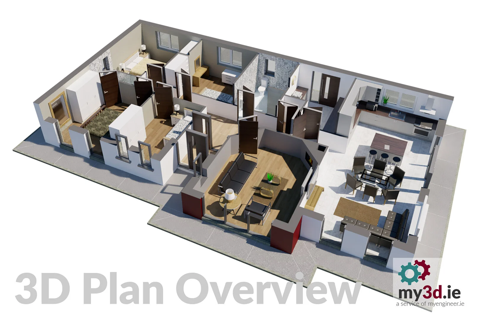3D Design. Do I understand the proposed design? Have I made any spatial mistakes? Are all of the rooms planned out properly? Is there room for all furniture and future needs (cots / wheelchairs / special care needs?). It is best to invest in 3D plans from my3d.ie if you cannot visualise the design. Also, if you can’t understand the design, how do you expect to be able to communicate your requirements effectively to others at build stage? Don’t set your mistakes in concrete, see it before you build it with a 3D model. Get a quote here.
